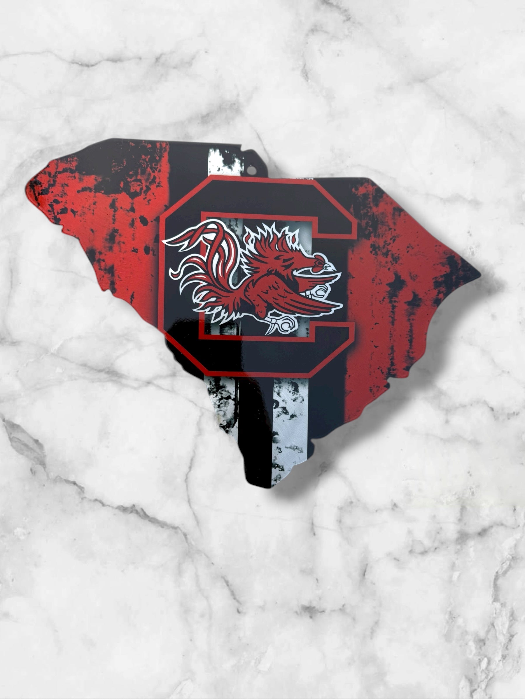 Show off your team spirit with this metal wall art featuring the iconic SC with gamecocks design. Whether displayed in your home or office, this piece adds a touch of school pride and makes the perfect gift for any die-hard fan. Go Gamecocks!